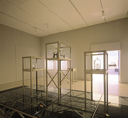 Charged Hearts (1997) occupies this new territory. The piece shamelessly mixes the look of an early science lab with an early 19th-century art museum display of collectibles under glass. Upon entering, the first impression is visually alluring and seems familiar. The art-gallery experience appears to tell the visitor, “look, contemplate, but don't touch.” Observe three simple brass cabinets. The two shorter ones are identical, each displaying a bell jar with a single, life-sized blown-glass heart. Inside each jar, an electrode emerges from a copper spool and descends into the main artery of the heart. Between these cabinets is a slightly taller one displaying a large, glass sphere with a small, dark sphere inside. Glass-blown onto two sides of the large sphere are electronic wires.