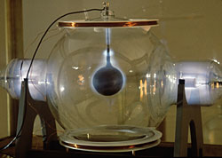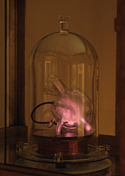 In the “don't touch” art-gallery experience, the boundaries between the visitor and the objects are well defined. It is understood where each begins and ends. But in Charged Hearts, the boundaries are blurred or non-existent. The point of this work begins when the visitor picks up the bell jar in the cabinet and turns the piece inside out. As the heart is grasped, it excites and begins to beat luminescently. Simultaneously the sphere, the terrella excites, forming a luminescent plasma cloud of electromagnetic weather, a miniature version of the unimaginable wireless dynamo that surrounds the earth and hides in our household television sets. Holding hearts, plugging in, spectators are literally and figuratively part of the electromagnetic fields, a phenomenon they can barely see but can sense.