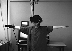 Some events can be called “found art.” Watching a human form tethered by wires, blinded by a helmet and computer images, gesturing with a gloved hand at the unseen, and followed by handlers, is one of these “events.” A kind of found performance art. These were the images of the first virtual-reality system when it became a civilian event as NASA, the U.S. space agency, moved technology from weapons development to a virtual environment lab. Since the user literally wore the technology, it was an enticing snapshot of immersion in new media environments. The technology was all over the body, tracking, so close to the senses that it seemed to be dealing directly with our ability to create mental images, plugging us directly into a system.