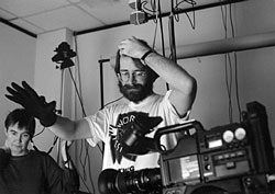 On the scientific research agenda was the question of simulating presence in virtual worlds. But if we were attempting to simulate presence in virtual bodies, we first had to ask a question: How did we know if we were present in our material bodies? This question led to scientitic expertise in the sense of proprioception, that is, the sense of inhabiting our bodies (how we know we are). Remarkably, the research demonstrated that this habitation of our material bodies turns out to be quite unstable. Household technology used on a blindfolded subject could illicit illusions of displaced bodies: an arm can be felt to be somewhere other than where it is, even inside the body. Artists at Banff became the willing victims of my inquiry. Fundamentally, the question became this: What might happen if we displaced this bodily presence and found a way to map it into virtual bodies?