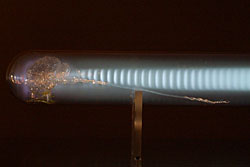 This brings us to the brain. The heart is an excitable tissue. So too is the brain. The follow-up piece to Charged Hearts is called I was scared to death / I could have died from joy (2000). In the piece, two stainless “clean” tables stand in a large, dim room, one at either end. On each table is an oversized test tube containing a blown-glass half brain, life-sized, with spinal nerves. As the viewer approaches, the brain suddenly appears to pulsate as the tube glows with luminescent gas in vertebrae-like patterns. As the viewer touches the tube, an excited plasma follows the fingers.