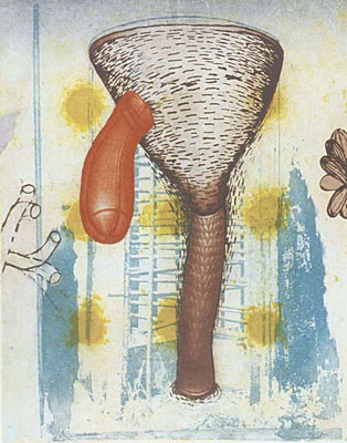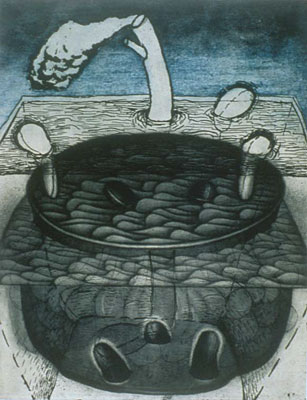 In my images drawn from walks in semi-rural Illinois, however, instead of focusing closely on objects, I pulled back in space a little and made the images somewhat more landscape in feeling. “Reservoir” is an image based on the drainage ditches and water reservoirs used by the corn farmers of the area. The print “Broken Tower” resulted from taking images suggested on my walks and merging them with the story of Daphne and Apollo. These prints are sensual and vividly coloured, quite different from the darker, more foreboding mood of the series based on Duke Bluebeard’s Castle.