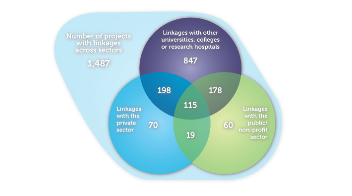 In today’s highly competitive research environment, external research linkages are essential, and research infrastructure acts as a catalyst for the creation and maintenance of those linkages. Of the projects funded by the Canada Foundation for Innovation in 2010-11, 1,487 (or 67 percent of the total) had external linkages. And of those projects, 403 had linkages with the private sector, contributing to the lab-to-market innovation process. Relationships between institutions and the public and non-profit sectors, which were present in 372 projects, help these sectors seek solutions to emerging and future challenges facing society. About a quarter of the projects had linkages with representatives from at least two sectors. Through such linkages, researchers are placed at the heart of knowledge and technology exchanges between sectors, creating a more integrated and efficient research environment.