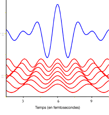 Toujours pas clair? Reportez-vous à l’illustration ci-dessous, qui représente une impulsion de 4,5 femtosecondes. Elle présente deux aspects de la lumière. Dans le premier, la lumière paraît sous la forme d’une vague (lignes rouges). Dans le deuxième, une courte impulsion est représentée par le total des vagues de longueurs différentes (ligne bleue). Les graduations sur l’axe horizontal sont séparées de 3 femtosecondes.