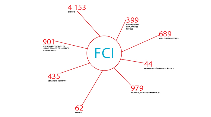En 2010-2011, l’infrastructure de recherche financée par la FCI dans les universités, les collèges et les hôpitaux de recherche a permis de générer :