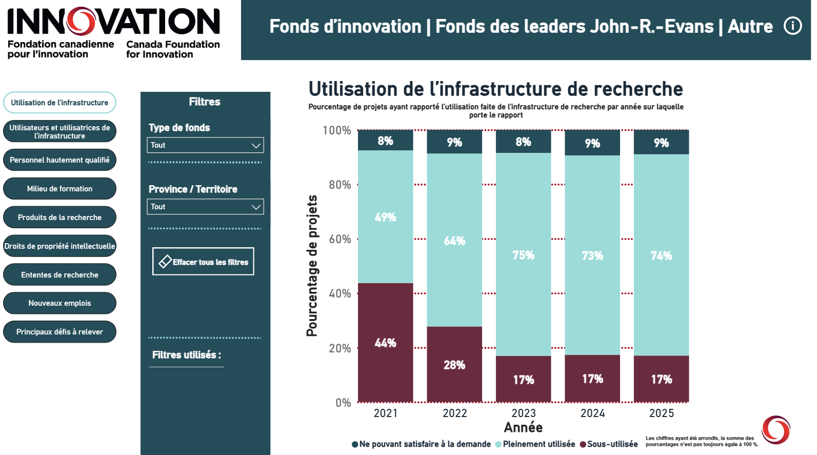 Ce tableau de bord interactif en ligne fournit un aperçu des principaux résultats et des principales retombées découlant des infrastructures financées par la FCI. Chaque graphique chronologique affiche la tendance qui s’est dessinée au cours des cinq dernières années et comprend des filtres par province/territoire et par type de financement afin d'améliorer l'analyse des données. Toutes les données chronologiques ont été recueillies au moyen d’un questionnaire en ligne que l’on nomme « rapport d’avancement de projet ». Ce questionnaire est rempli par les responsables de projets de recherche (notamment les projets financés au titre du Fonds des leaders John-R.-Evans et du Fonds d'innovation), et soumis par l’établissement hôte de l’infrastructure financée par la FCI, après la mise en service de celle-ci. Chaque établissement doit soumettre un questionnaire par projet d’infrastructure financé au plus tard le 30 juin de chaque année, et ce, pendant une période de quatre à cinq ans, selon le montant de la contribution financière qu’il a reçue. Le tableau de bord sera mis à jour chaque année au fur et à mesure que de nouvelles données seront disponibles.